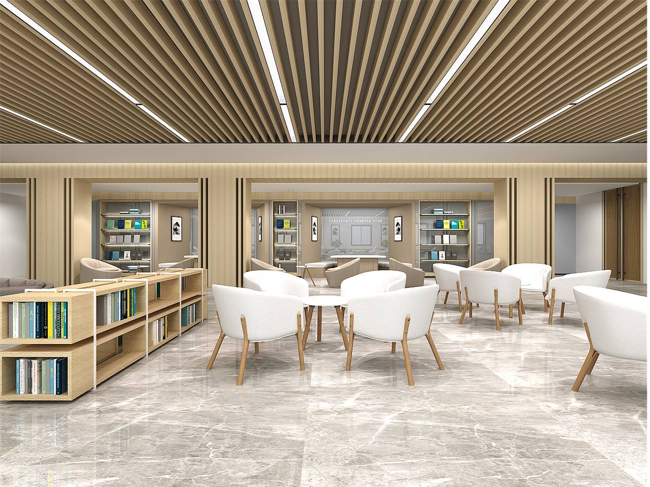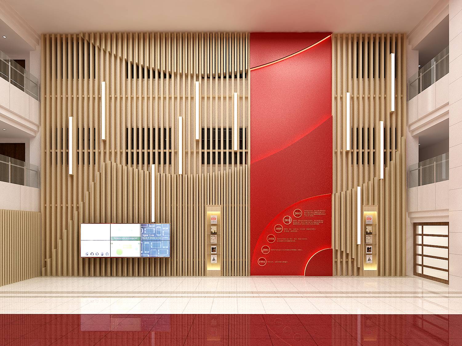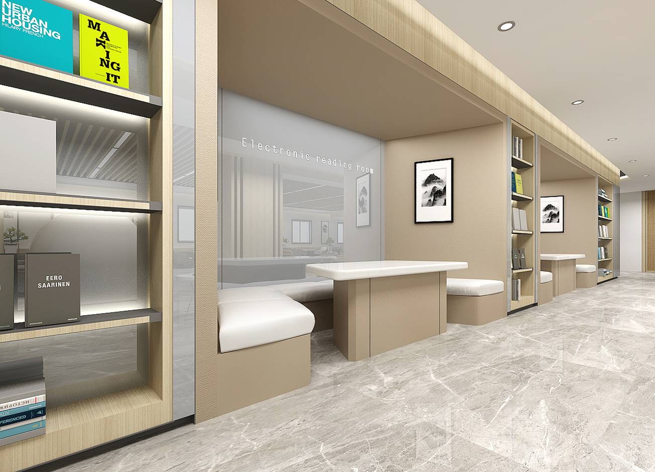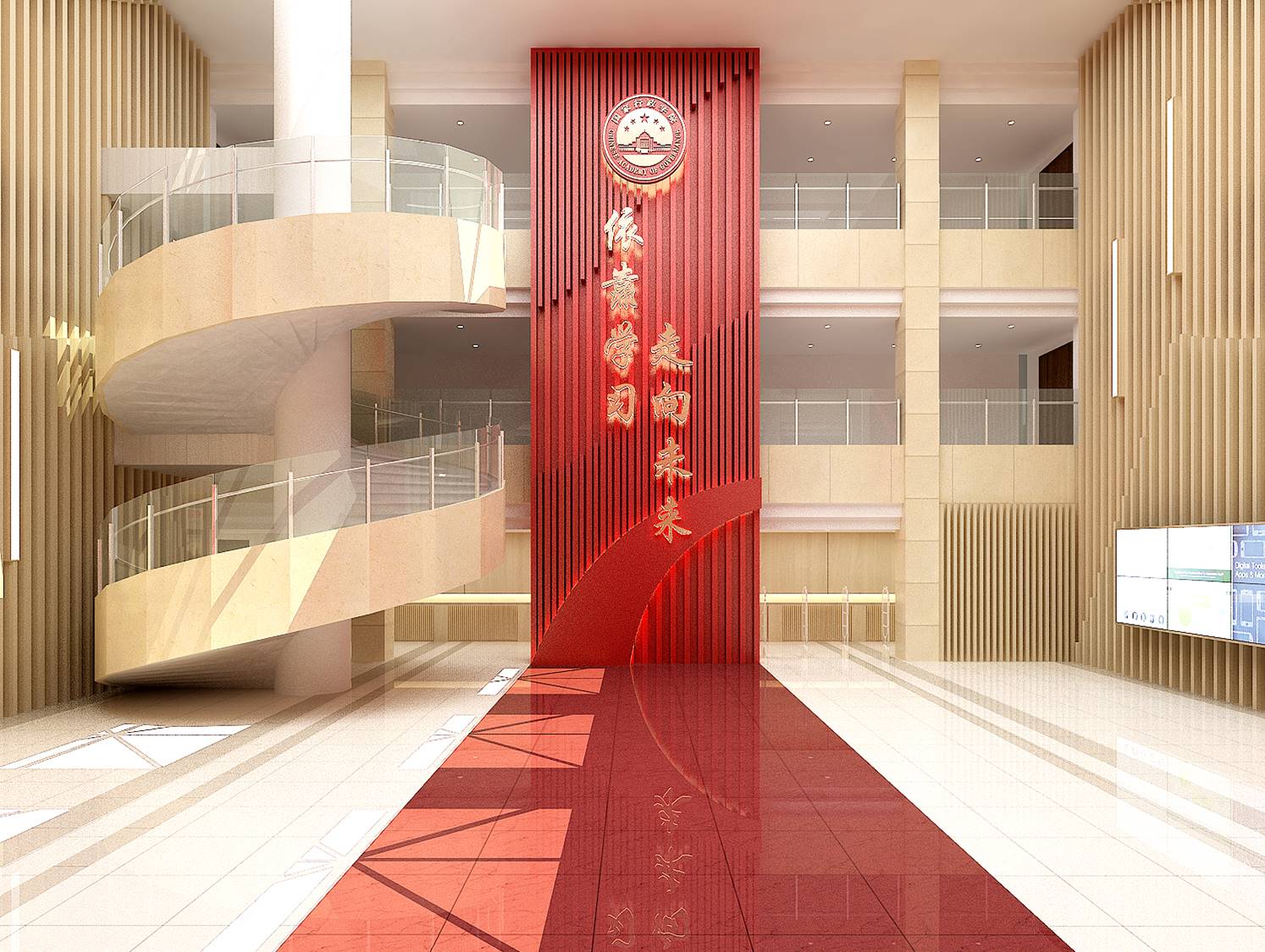 在保持傳統(tǒng)圖書館功能的前提下,以莊重、大氣、現(xiàn)代化為設(shè)計原則,針對圖書館大廳及閱覽室兩部分,既有莊嚴、明亮的大廳設(shè)計也有輕松、活潑、舒適的閱覽室設(shè)計,為國家行政學院圖書館打造具有學院形象、圖書閱覽、學員交流、教研成果的互動展示空間。